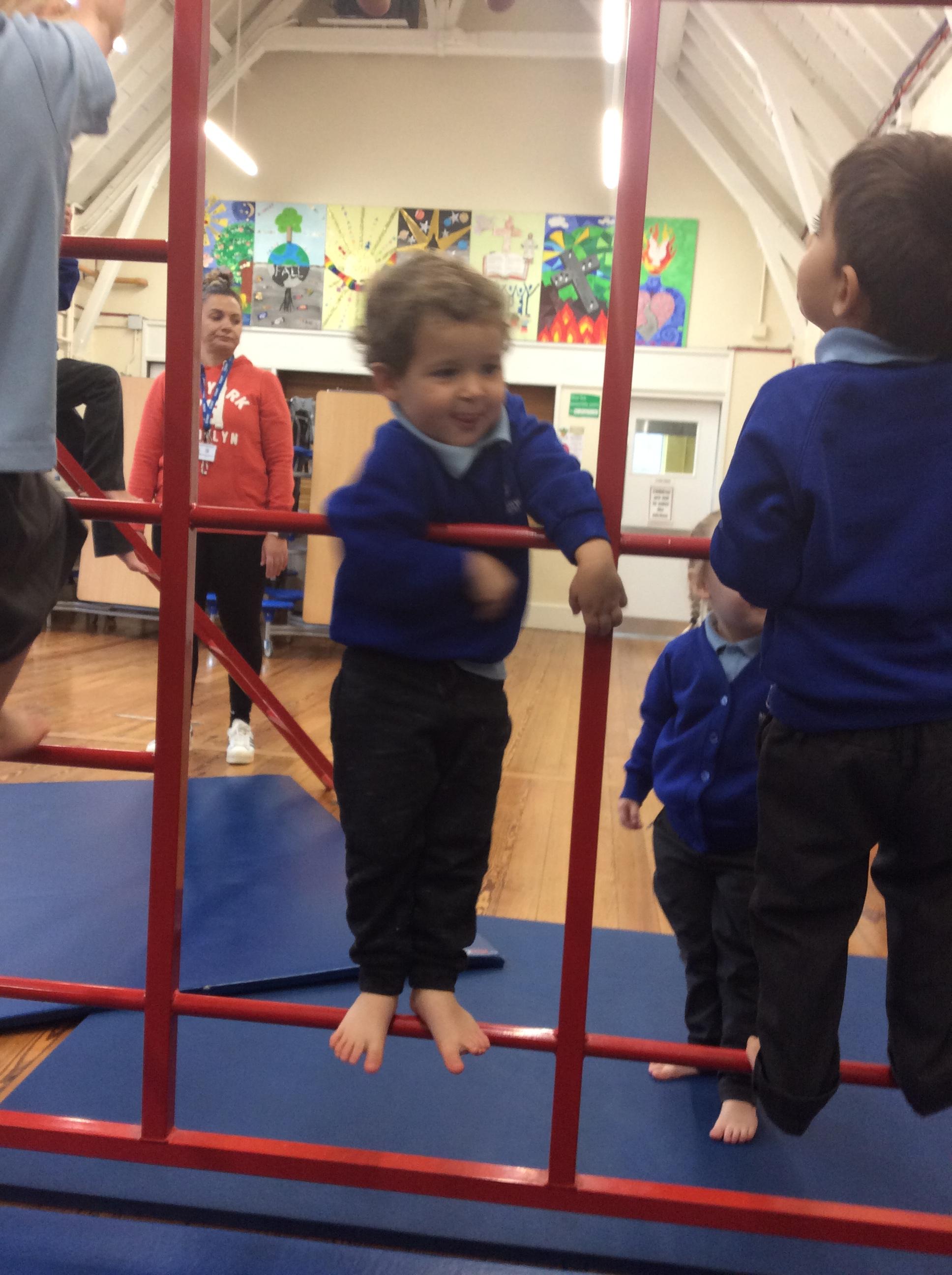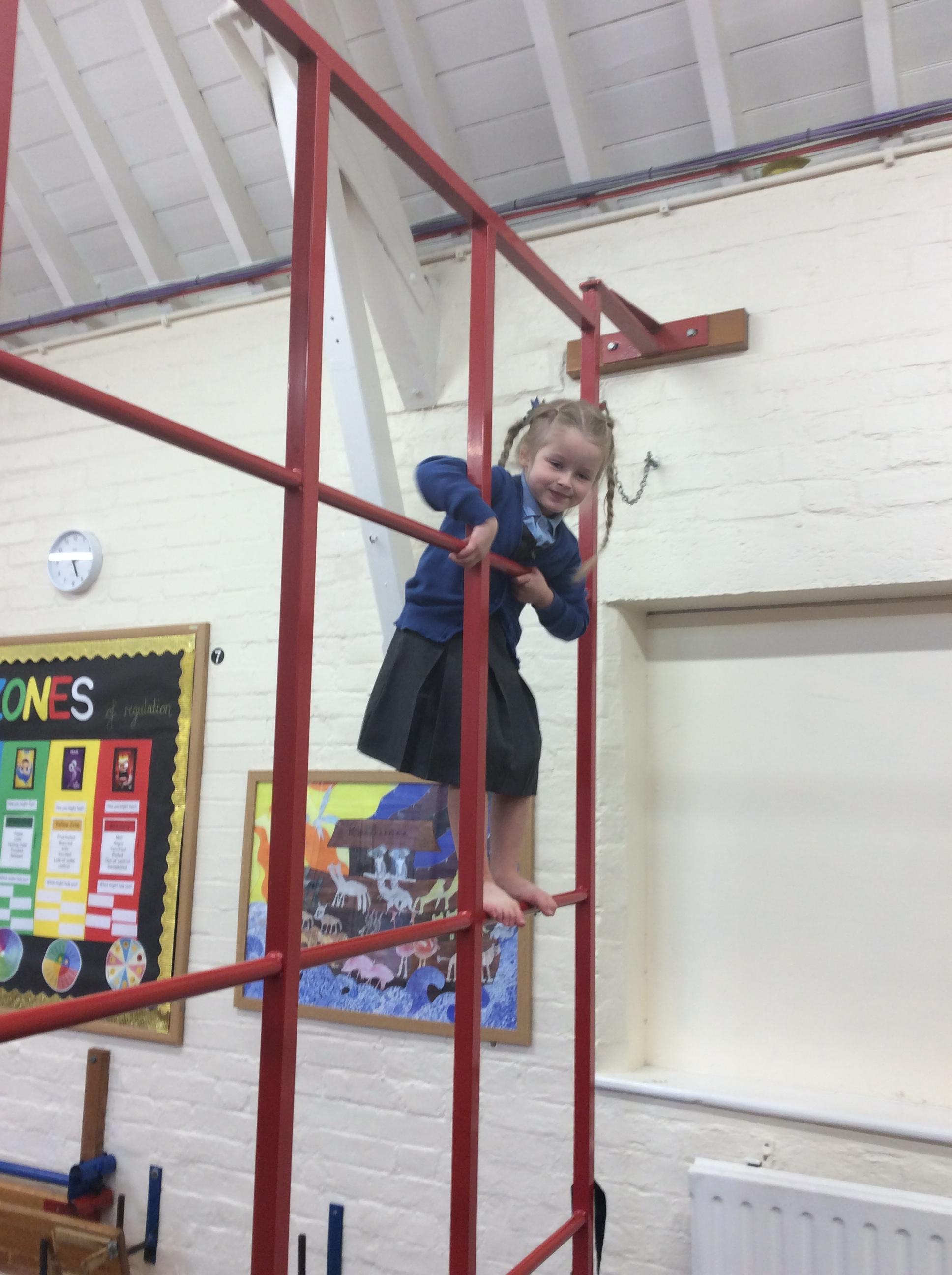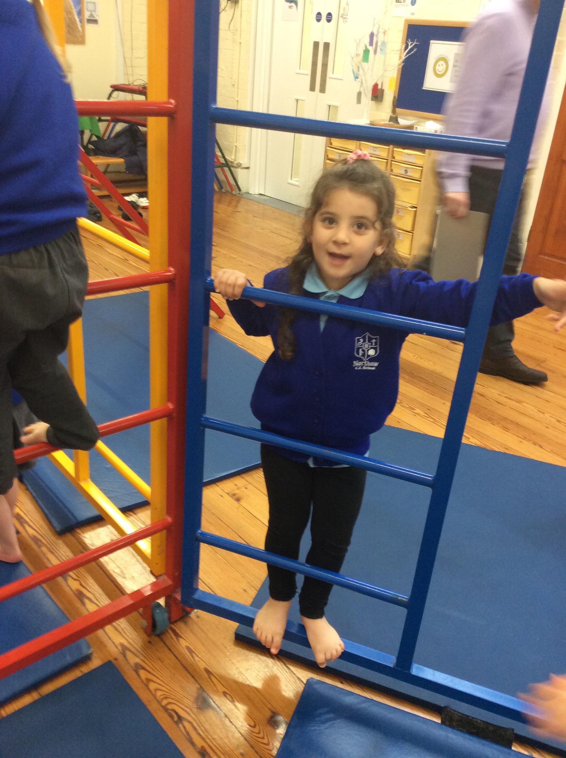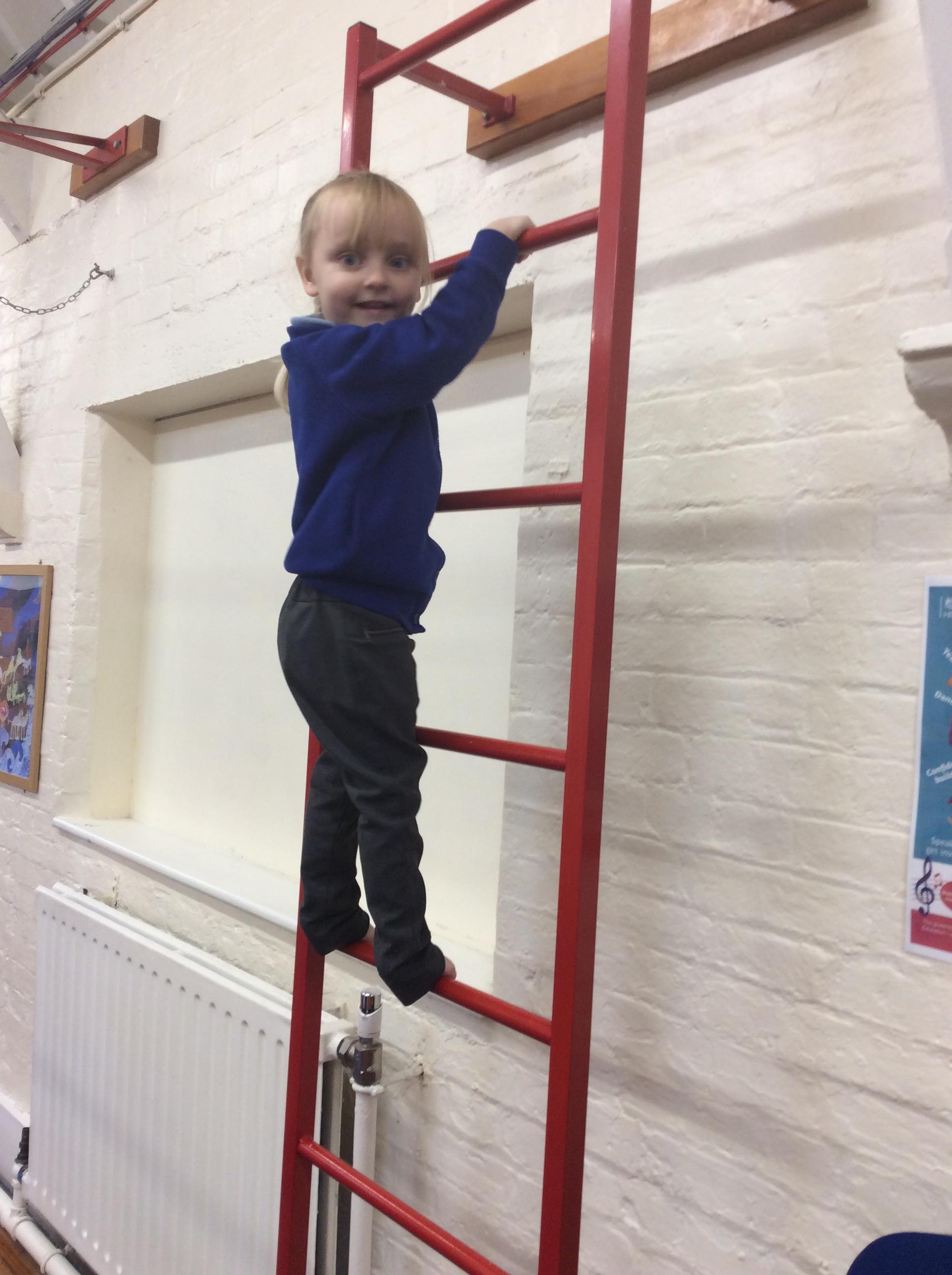 Today we had an exciting morning. In the hall we got the wall bars out. We talked about the rules and how to use them safely. Some of the children were reluctant to at first however they were all brave and all had a go. The children were proud to show how high they have gone. Well done all of Acorns class.