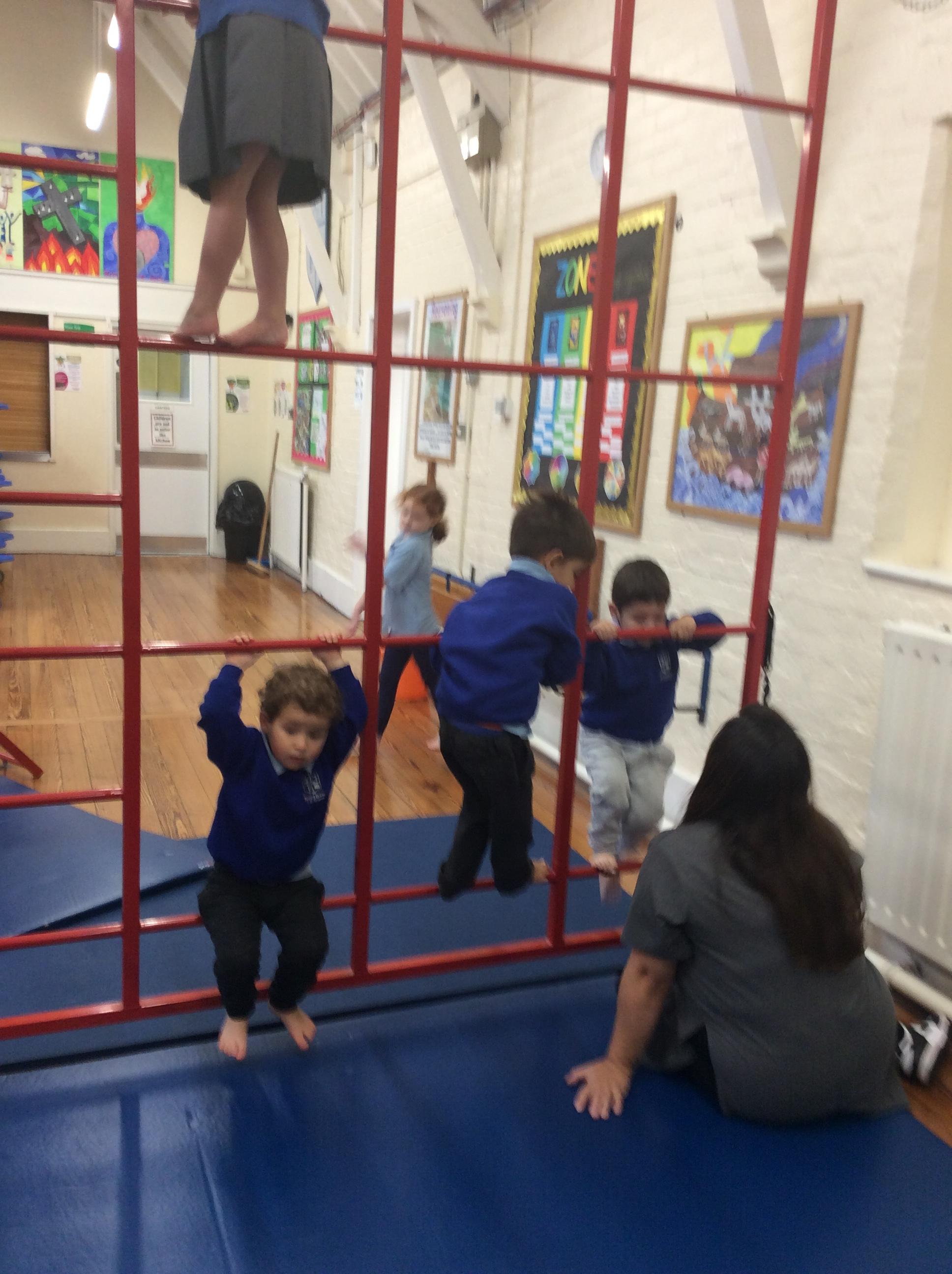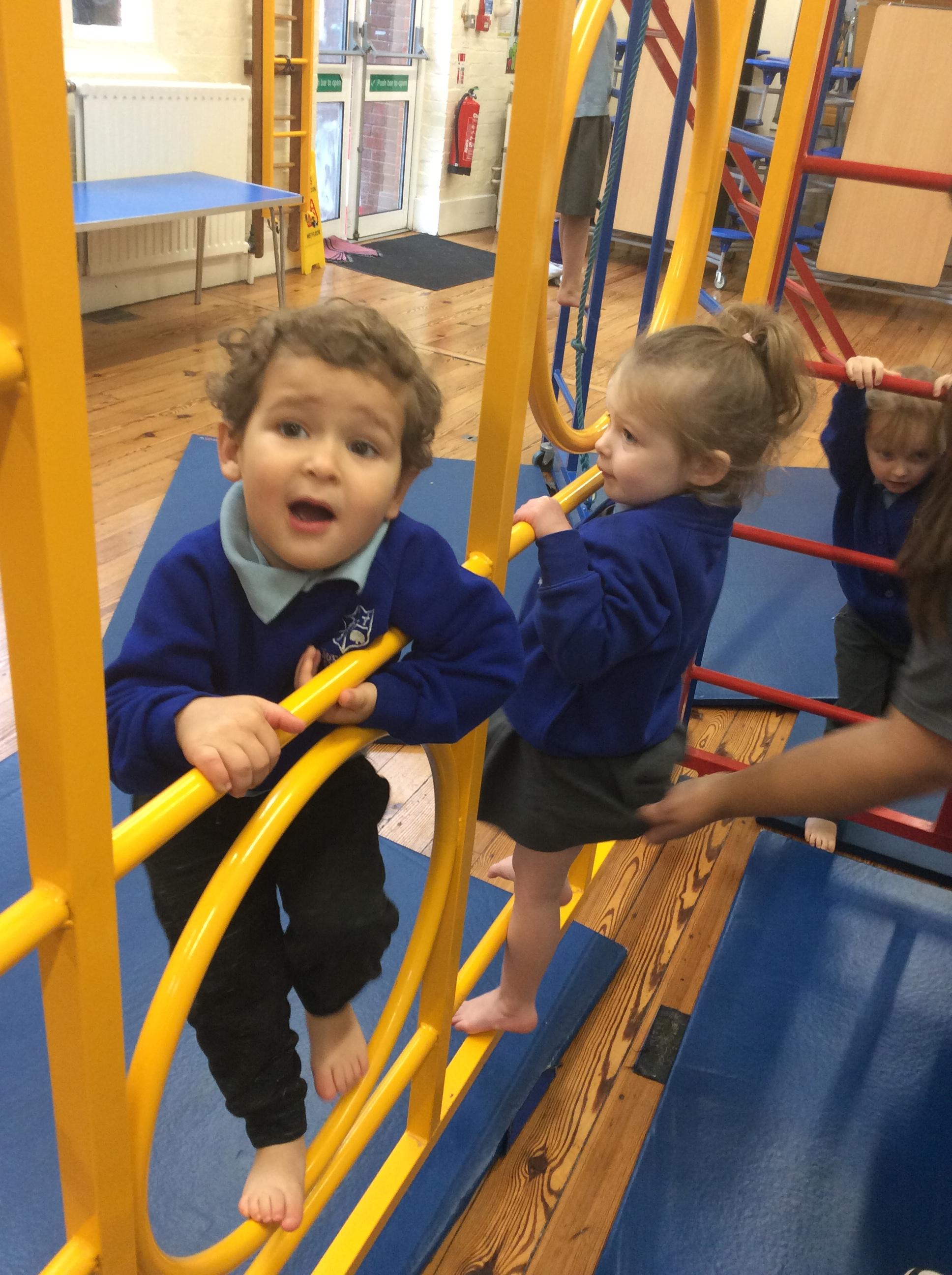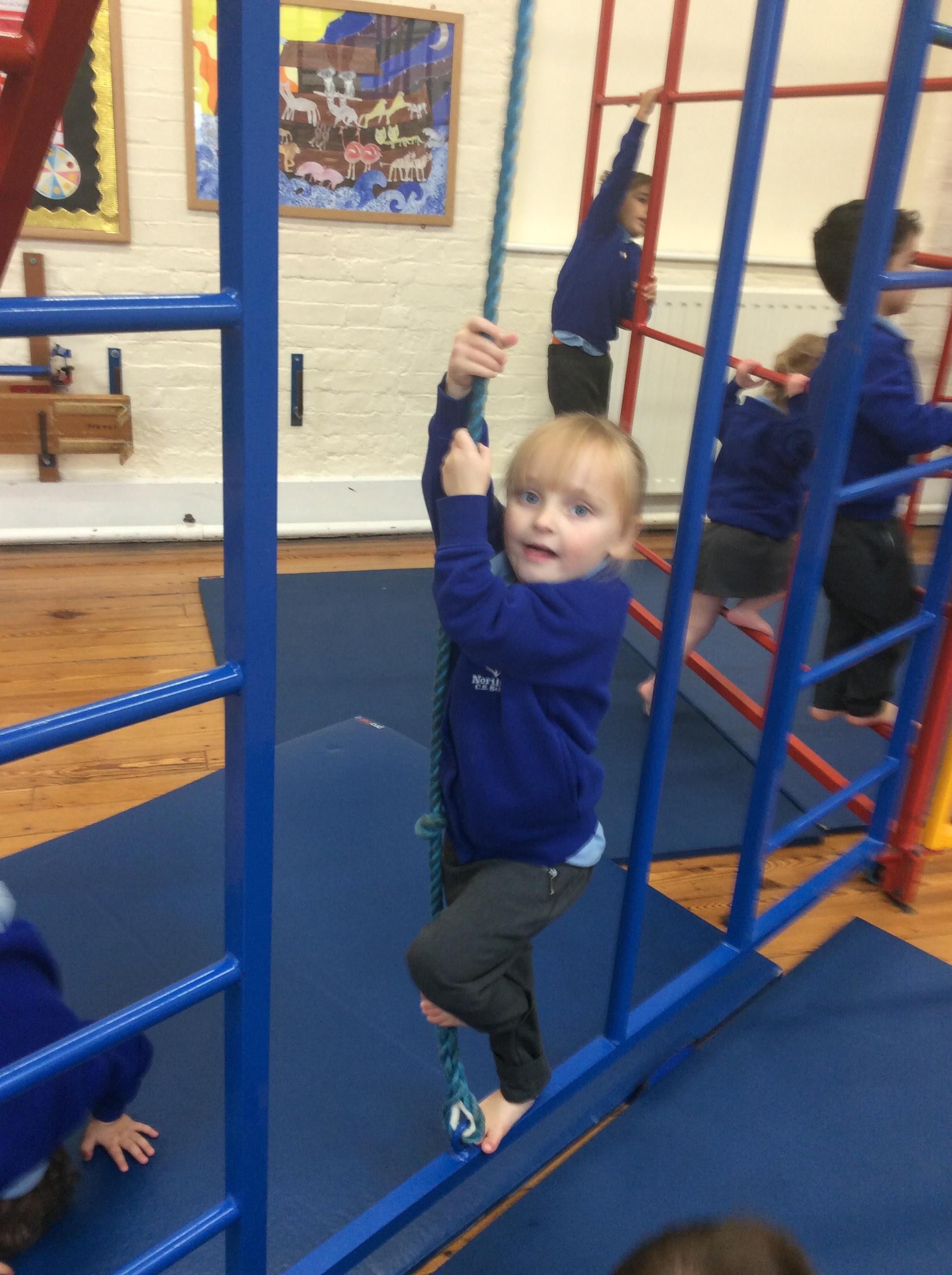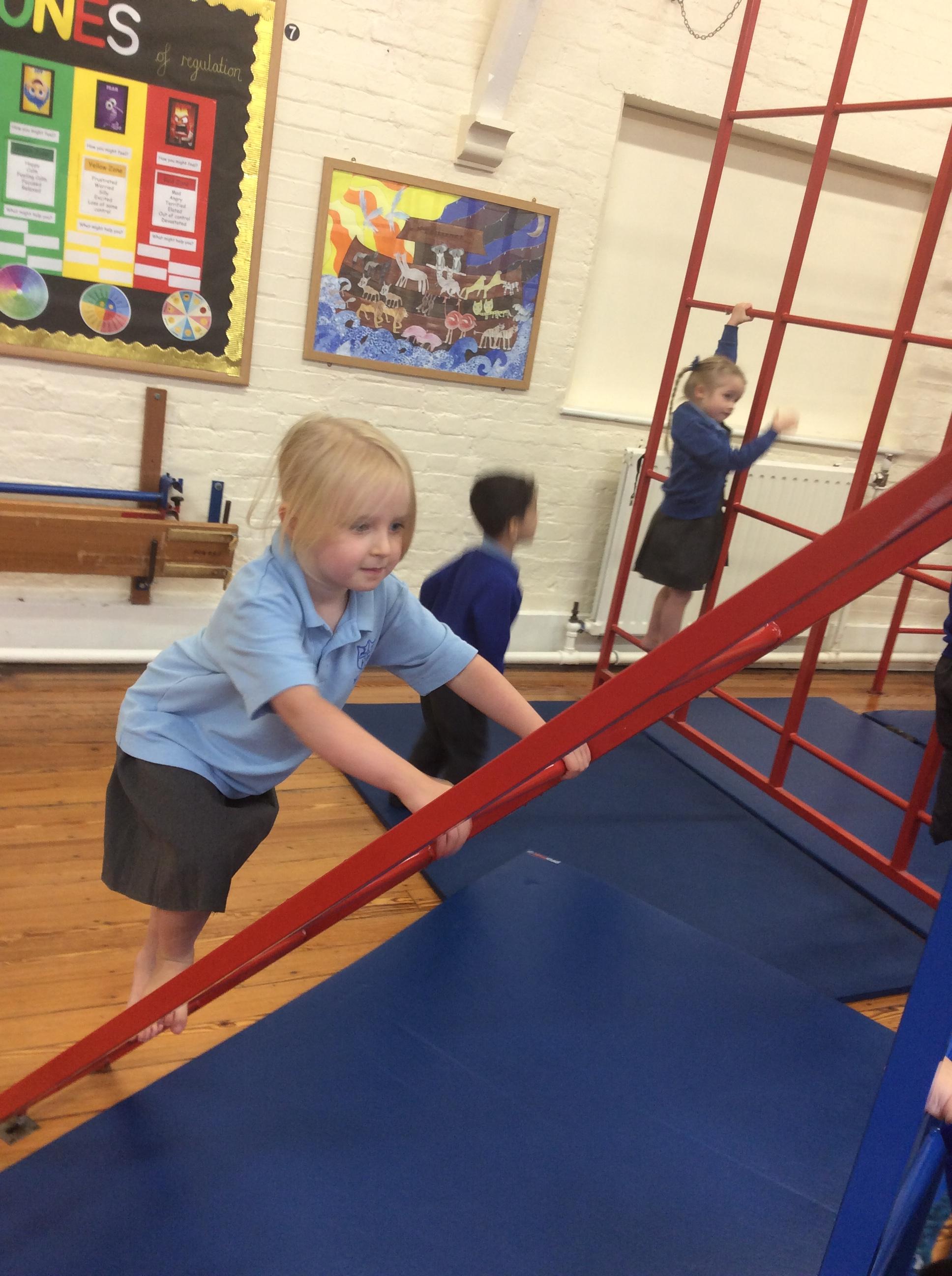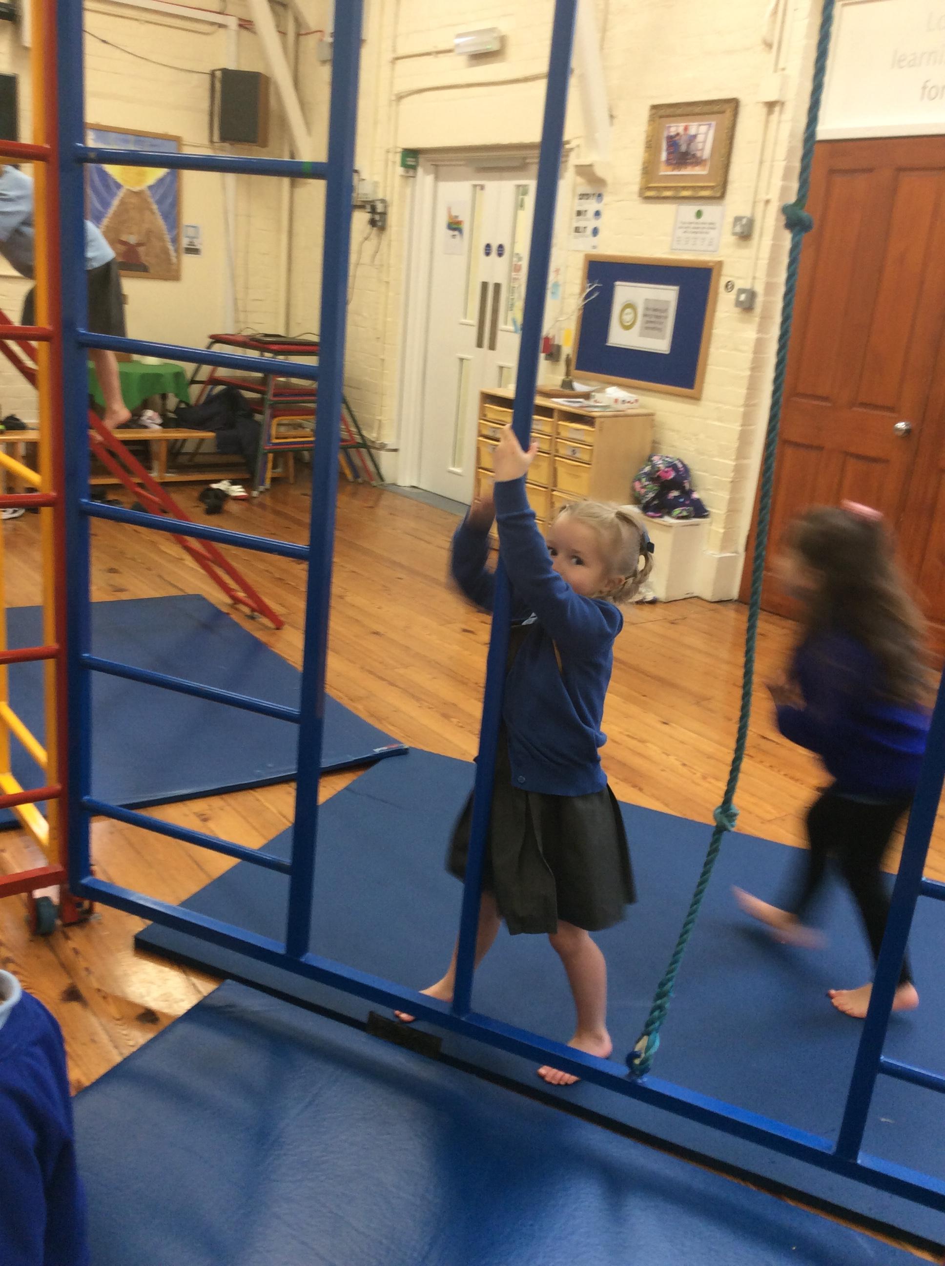 Today we had an exciting morning. In the hall we got the wall bars out. We talked about the rules and how to use them safely. Some of the children were reluctant to at first however they were all brave and all had a go. The children were proud to show how high they have gone. Well done all of Acorns class.