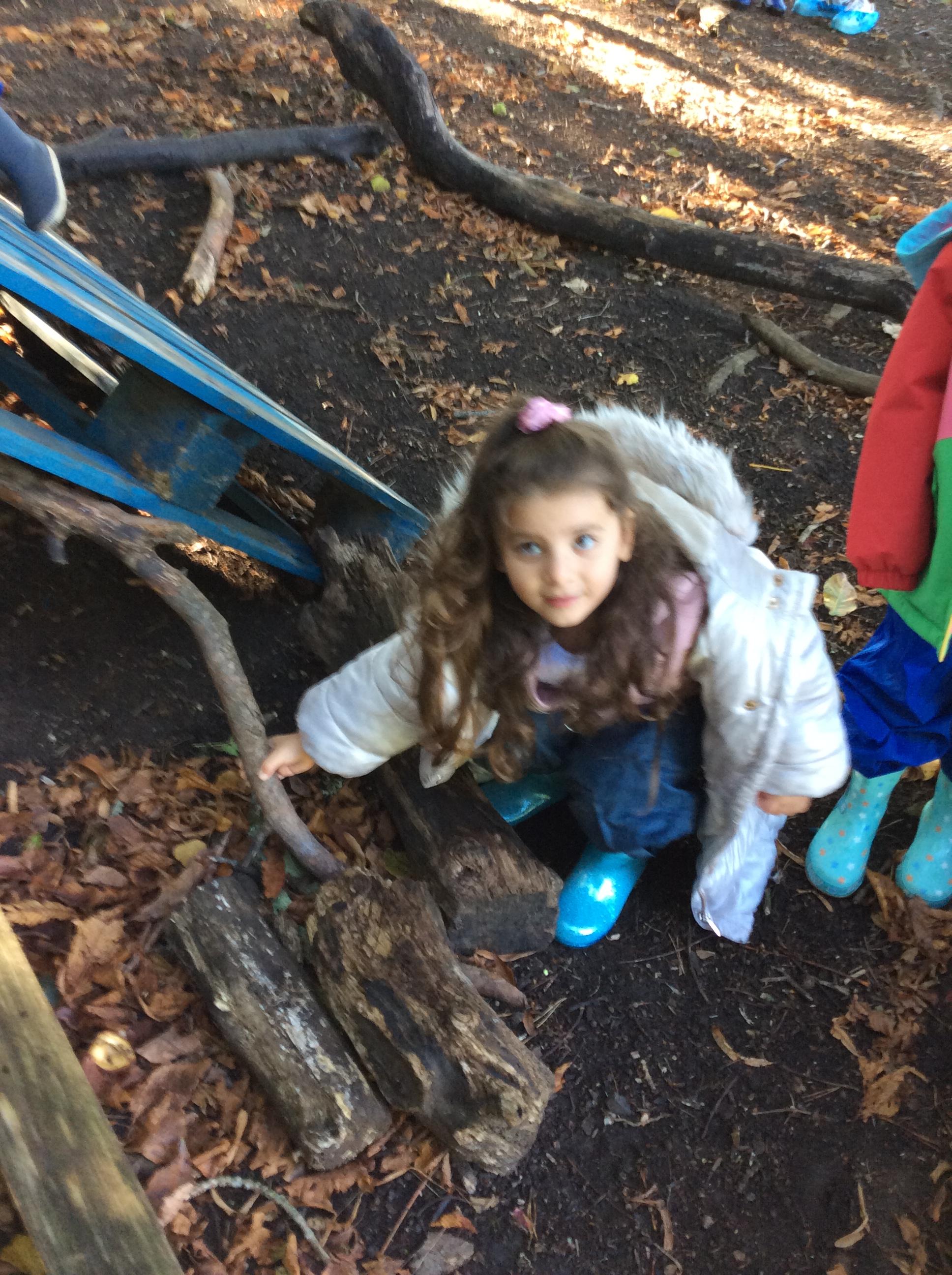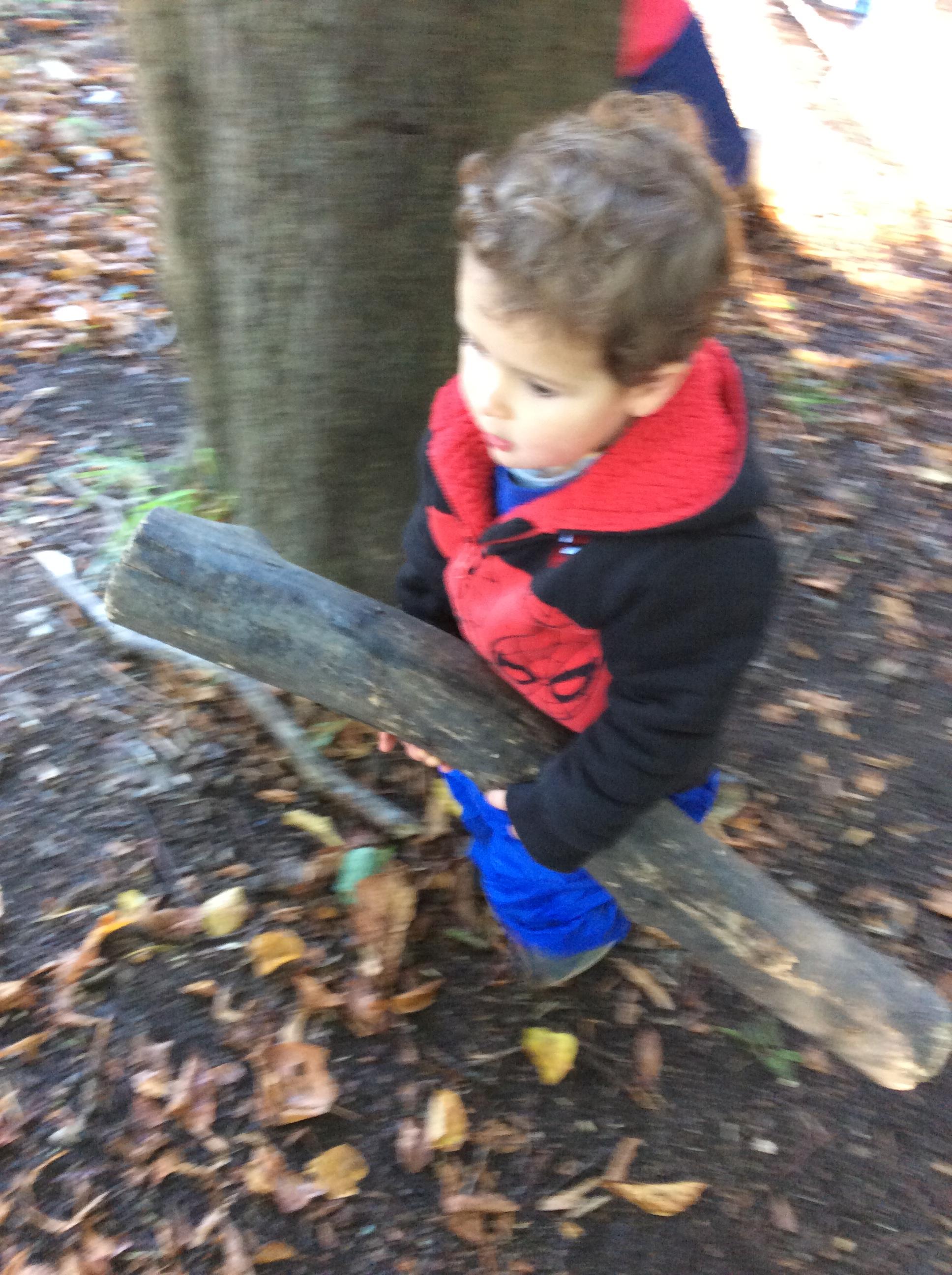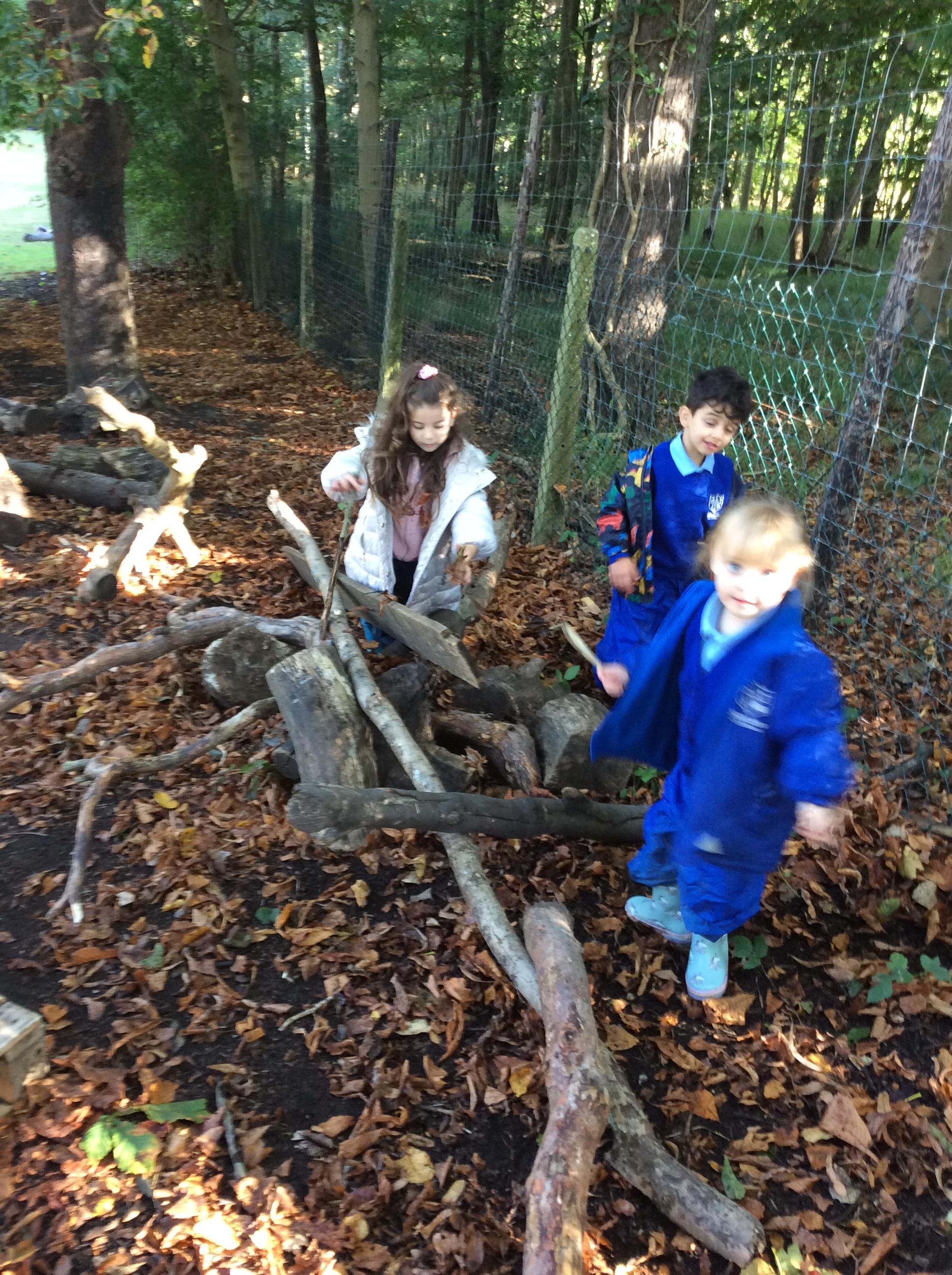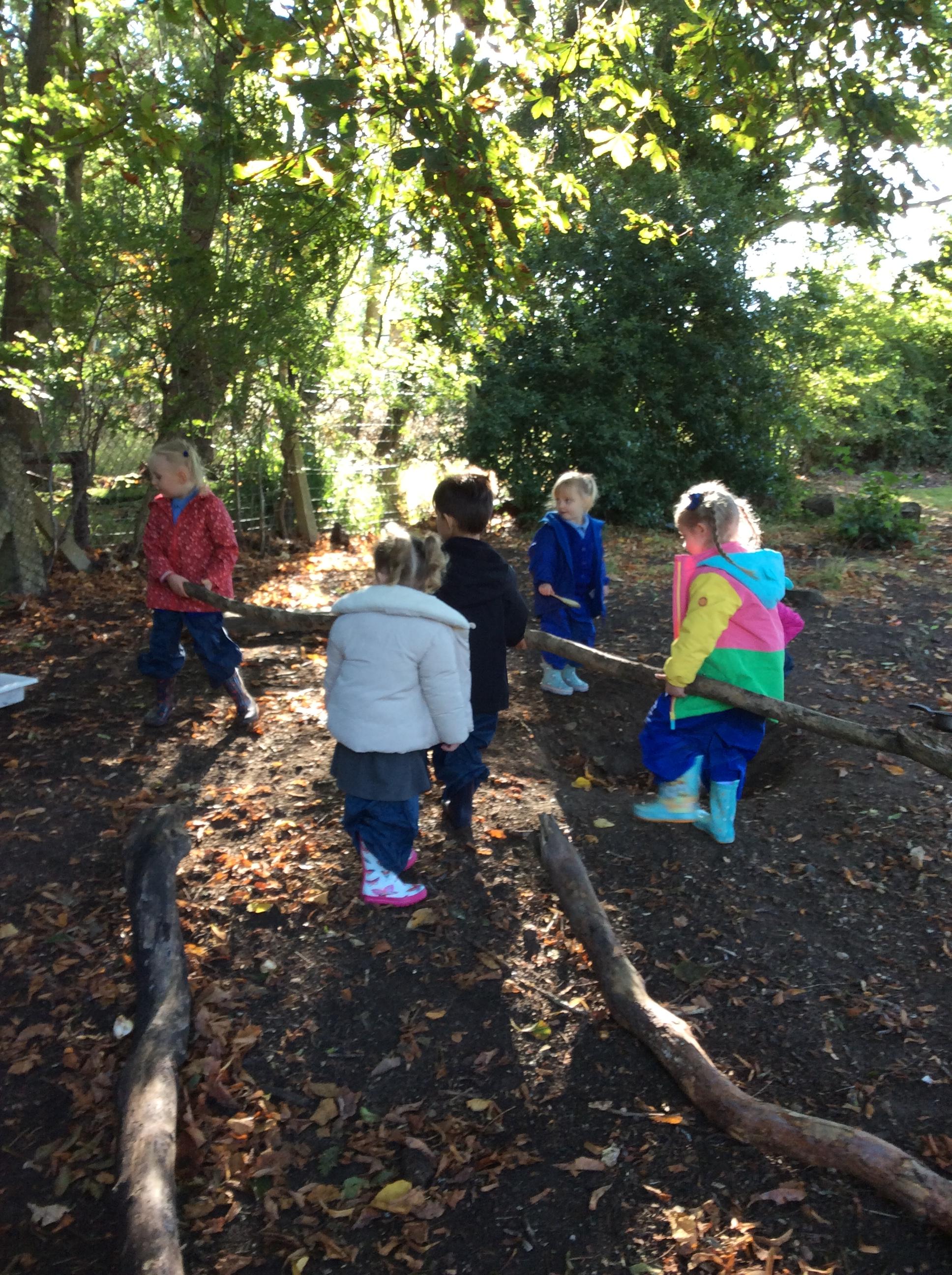 Today we had our first forest session. The children enjoyed exploring the forest. We talked about the rules including how we are allowed to pick up sticks and logs but "bigger than you carry with two, bigger than me carry with three". The children decided to make a campfire and this included picking up lots of sticks and logs. The children worked really well as a team to do this.
